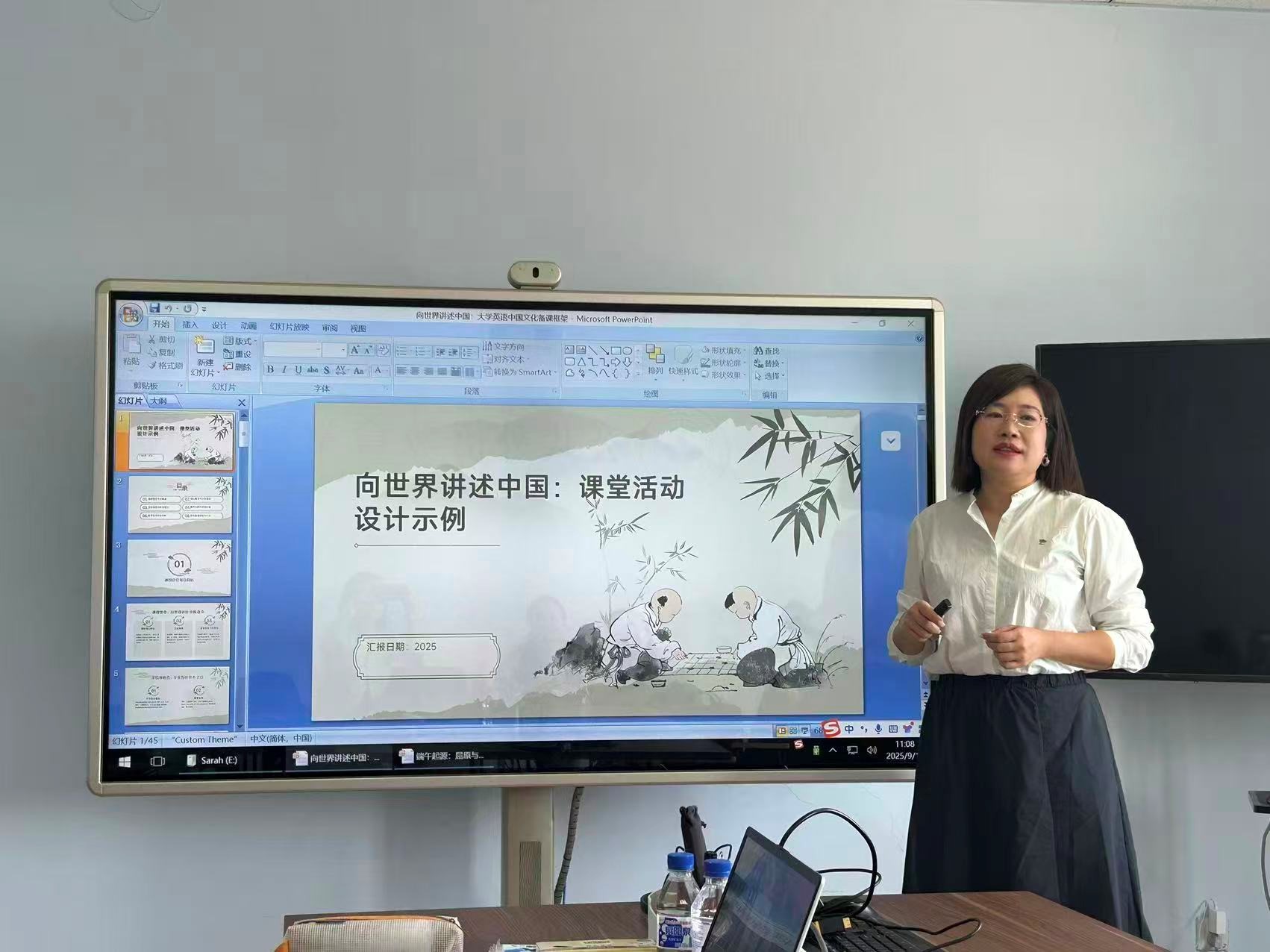 随后,主讲教师宋丹老师进行了说课展示。她详细介绍了初步的教学设计,包括以视觉谜题导入、核心文化词汇铺垫、多模态视听材料输入、小组讨论辨析以及“文化大使”模拟展示等环节。宋丹特别强调了“任务驱动”和“学生中心”的教学理念,认为:“整堂课应形成一个‘语言输入—内化思考—语言输出’的完整闭环,让学生在实践中学习,在表达中运用。”
